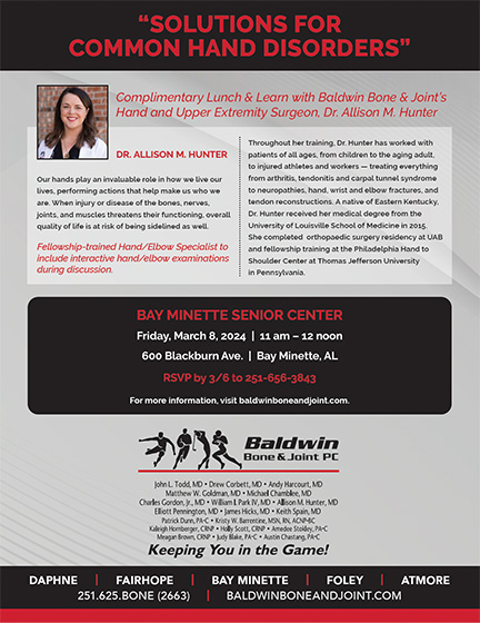 DAPHNE, AL (February 12, 2024) – Daphne-based orthopaedic practice, Baldwin Bone & Joint continues its Winter 2024 Community Education Series in March 2024 in both Bay Minette and Daphne, Ala. A complimentary lunch will be provided to all who RSVP prior to each event.